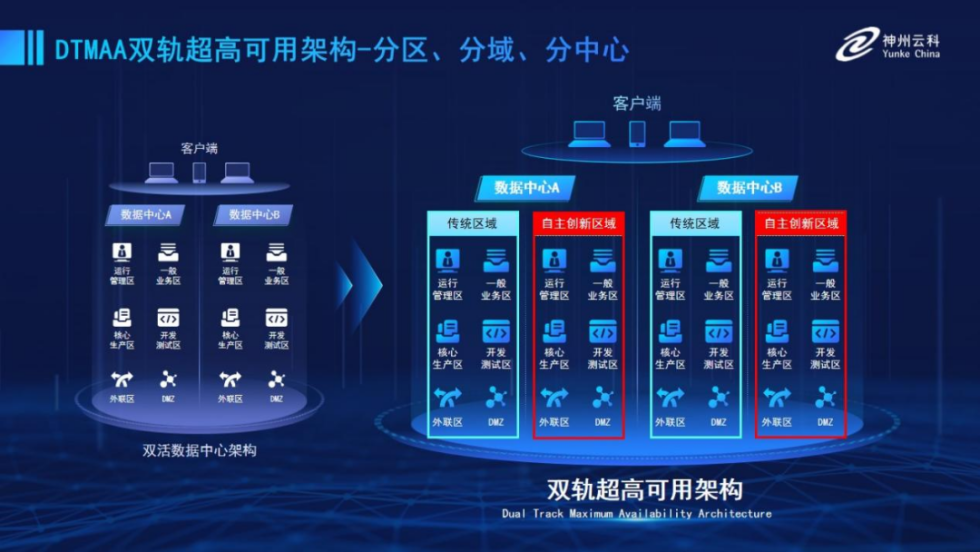 为帮助金融客户更好地应对数字经济时代对可持续性的高要求,实现“信创”与“数字化”齐头并进,yl23411永利推出了双轨超高可用架构。该架构在双活数据中心的分区调度基础上,增加信创域和非信创域的分域调度,实行信创域与传统域应用全量部署,使双中心运营变为双中心四区域并行运行,互为多活,将“0到1”的单轨建设道路变为分区分域协同的多活双轨超高可用架构。帮助客户在新架构下,保障“信创”的同时解决性能瓶颈,提升稳定性,保证应用可持续性,最终实现信创区域和非信创区域的平滑过渡,完成国产化替代目标。